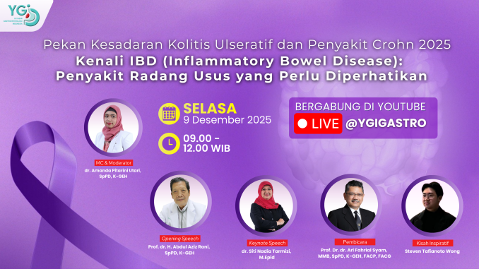 Kami dengan senang hati mengundang Sahabat YGI untuk hadir dalam Pekan Kesadaran Kolitis Ulseratif & Penyakit Crohn 2025 yang akan disiarkan melaui YouTube Live di @ygigastro.